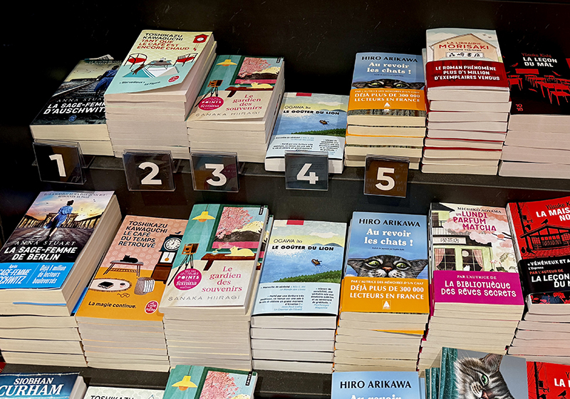先日、近所のFNACの書籍売り場をぶらぶらしていたときのこと。外国文学の人気ランキングのコーナーがあり、なんと2位から5位まで日本人作家の小説が並んでいて、うれしい驚きに思わず写真を撮ってしまいました。ちなみに1位は、イギリス人作家Anna StuartのLa Sage-femme d’Auschwitzでした。2022年10月号の『ふらんす』にて、日本の現代小説がフランスで多く読まれるようになっており、特にRomans feel-goodと呼ばれる癒し系ジャンルが人気と書きましたが、あれから3年が経った今も、その傾向は続いている、というより、ますます強くなっているかもしれません。ランキングはこちら。