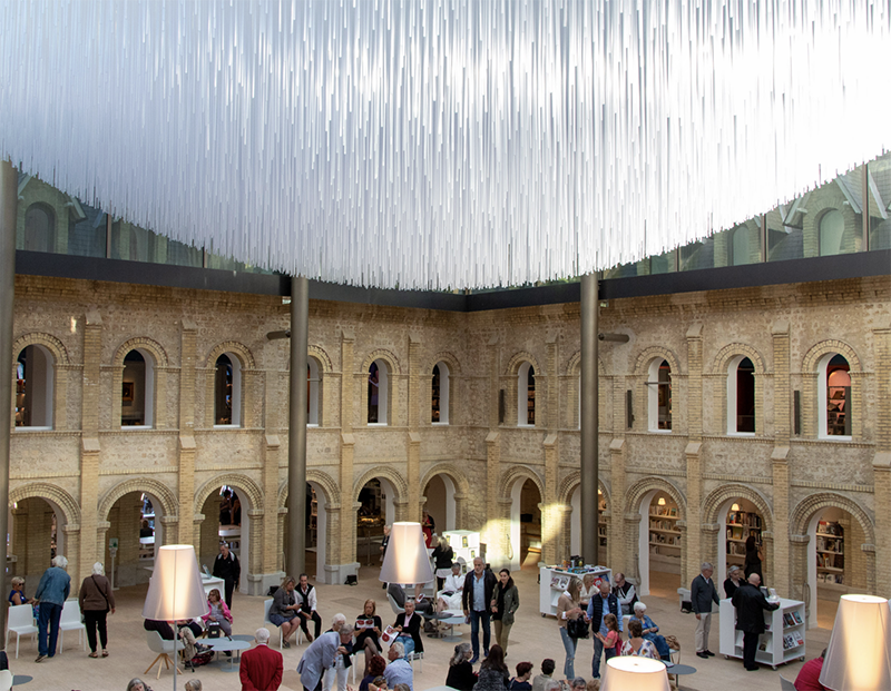まずは、これまでにも何度か取り上げたドーヴィルの「レ・フランシスケーヌ Les Franciscaines」。かつてフランシスコ会女子修道院だったことからこの名が付けられている。回廊を覆う透明な屋根から吊り下げられたオブジェは詩的で、館内は図書館、美術館、カフェが一体となって共存している。図書館の壁には絵画が惜しみなく展示され、閲覧室はそのまま憩いの空間となっており、どの空間も遊び心にあふれている。専用の展覧会スペースでは、海洋世界をテーマにしたピエールとジルの個展を1月4日まで開催中で、特別に制作された新作がなんと4点も展示されている。かつての教会部分は、音響に優れたコンサートホールとして活用されている。