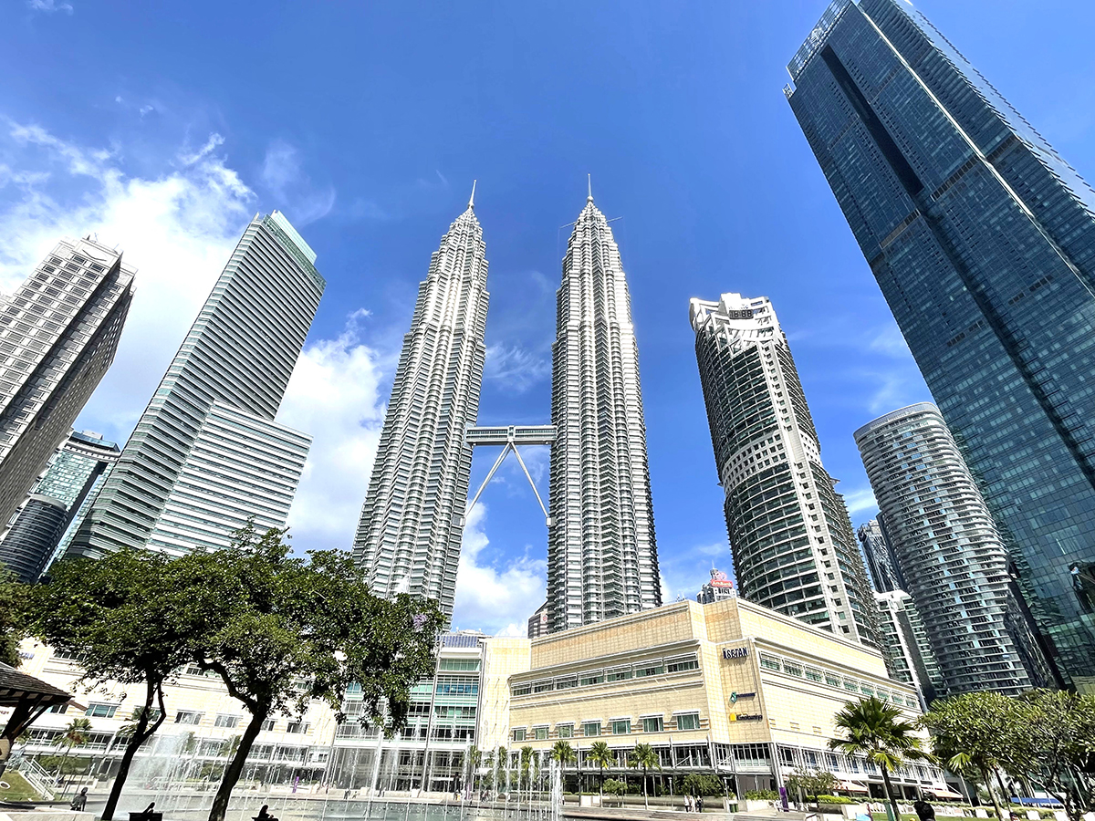 クアラルンプールのシンボル的な高層建築ペトロナス・ツインタワー。国立石油会社ペトロナスの名前に由来し、タワー1には同社のオフィスが、タワー2には中東のカタールの衛星テレビ局アルジャジーラや、イギリスの通信社ロイター通信、アメリカのマイクロソフトなど多国籍の外資系企業のオフィスが軒を連ねている。タワー真下のスリヤKLCCショッピングモールには、日本の紀伊国屋書店や伊勢丹も入居し、賑わっている。(著者撮影)