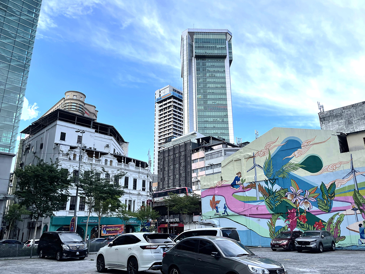 クアラルンプール中心部の古い建物に描かれた大胆な壁画。古い街並みを歩くとこうした建物をよく目にする。壁画があることで手前の駐車場がより明るく安全に感じられる。(著者撮影)