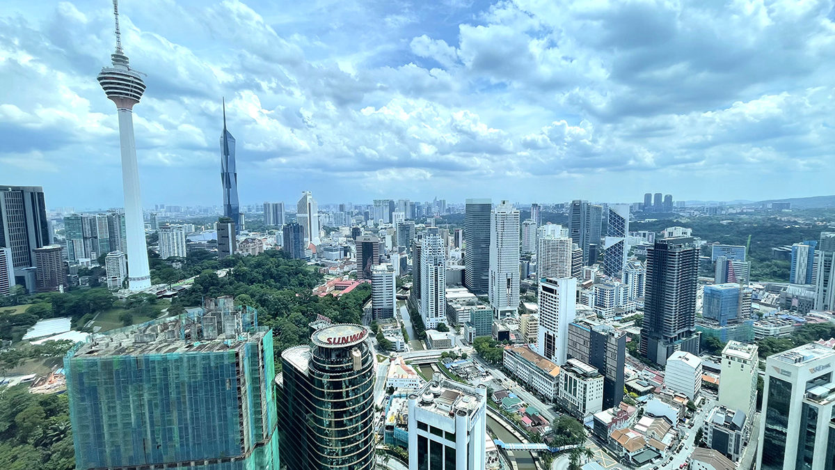 クアラルンプール中心部都心のビル街。左側にある白いタワーが通信塔としては世界で4番目に高いKLタワー。その奥のガラス張りはコロナ禍後の2023年に完成したムルデカ118。高さ679メートルで超高層建物ビルとして世界第2番目の高さを誇る。著者撮影